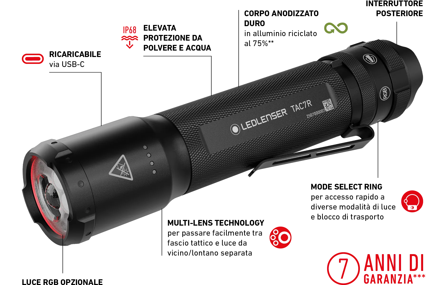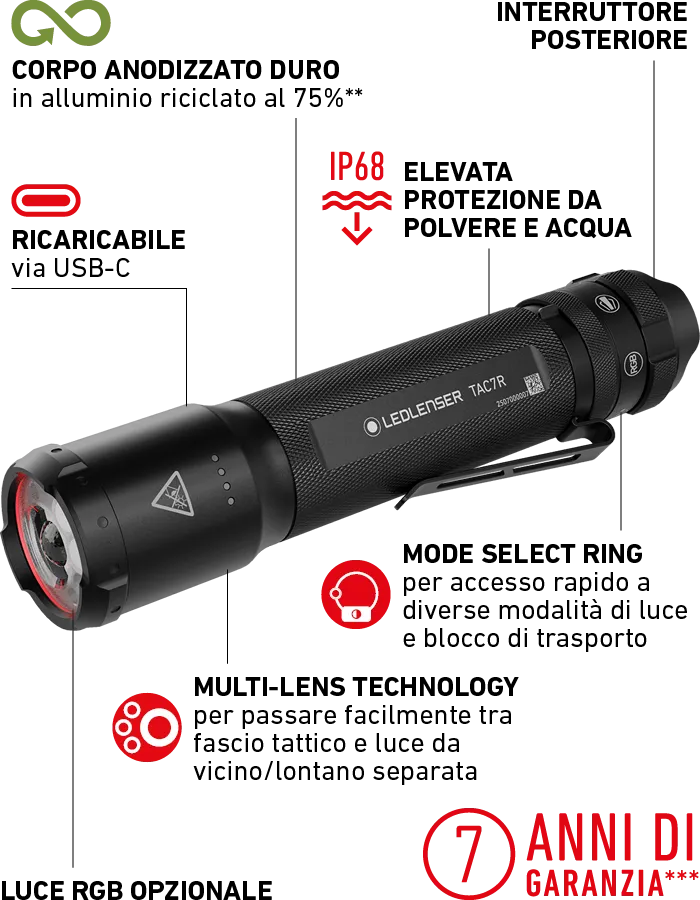 Con la TAC7R, nulla può andare storto. È robusta, facile da usare grazie al Mode Select Ring e all’interruttore tattico sul fondello, ed è dotata di luce RGB aggiuntiva – ideale per le forze di polizia o di sicurezza.